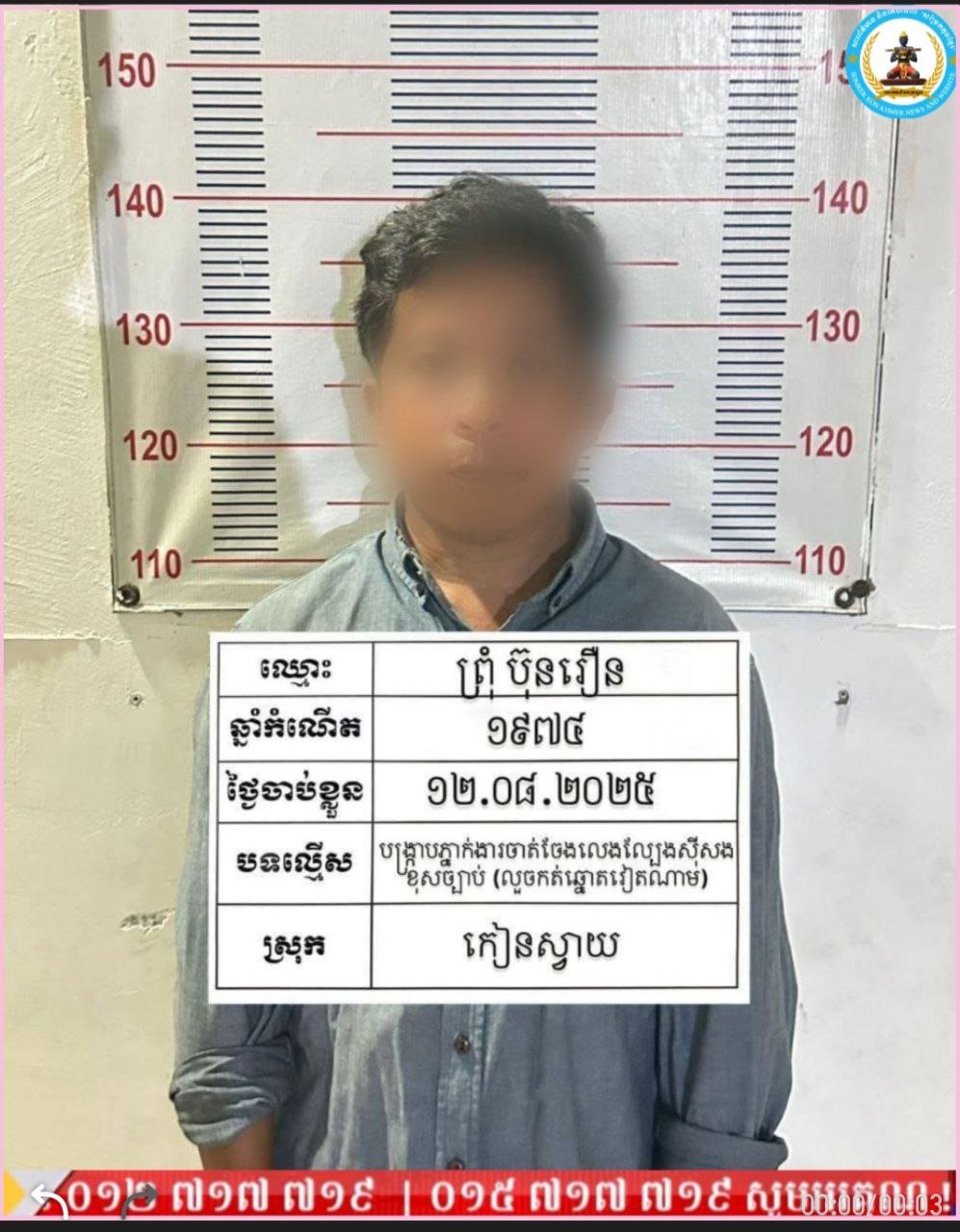 -ឈ្មោះព្រុំ ប៊ុនធឿនភេទប្រុសអាយុ៥១ឆ្នាំជនជាតិខ្មែរ មុខរបរកត់ឆ្នោត មានទីលំនៅភូមិគគីរធំឃុំគគីរធំ ស្រុកកៀនស្វាយខេត្តកណ្តាល(ឃាត់ខ្លួន)។