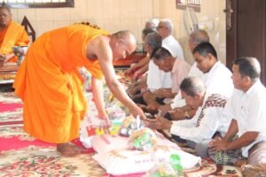 ព្រះវិជ្ចានុរ័ក្ខញាណខឹម សុផនចៅអធិការវត្តស្លាកែតធ្វើទានដល់តាជី.យាយជីនិងកម្លាំងប្រជាការពារនៅមុនថ្ងៃដាក់បិណ្ឌ