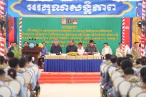 ថ្លែងក្នុងពិធីនេះ ឯកឧត្តម គួច ចំរើន អភិបាលខេត្តកណ្តាល បានថ្លែងនូវការកោតសរសើរដល់មន្ត្រីភូមិបាល អាជ្ញាធរស្រុក ភូមិ-ឃុំទាំងអស់ ដែលខិតខំយកចិត្តទុកដាក់ខ្ពស់ក្នុងដំណើរការវាស់វែង ចុះបញ្ជី និងបិទផ្សព្វផ្សាយ តាំងពីពេលចាប់ផ្តើមរហូតឈានដល់ការចែកប័ណ្ណជូនប្រជាពលរដ្ឋនាថ្ងៃនេះ។ ឯកឧត្តមអភិបាលខេត្ត បានជំរុញ និងលើទឹកចិត្ត ដល់មន្ត្រីជំនាញនៅស្រុក និងភូមិ-ឃុំ សូមបន្តខិតខំពន្លឿនការចែកបណ្ណកម្មសិទ្ធដីធ្លីជូនដល់ប្រជាពលរដ្ឋឱ្យបានឆាប់រហ័សបន្ថែមទៀត ហើយនៅពេលដែលផលិតបណ្ណរួច សូមធ្វើការចែកជូនដល់ប្រជាពលរដ្ឋឱ្យបានគ្រប់ៗគ្នា ហើយរាល់ការចែកបណ្ណត្រូវប្រមូលផ្តុំនៅច្រកចេញចូលតែមួយរបស់ស្រុក ដើម្បីងាយស្រួលដល់បងប្អូនប្រជាពលរដ្ខមកទទួលយកបណ្ណរបស់ពួកគាត់។